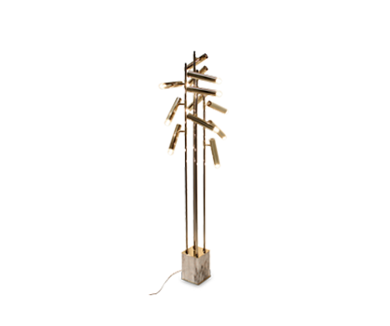 CYPRES, Latin for Cypress, is a tree of many symbolisms and ornamental capabilities, often seen in artistic works and gardens. The unmistakable foliage grows in dense, dark green sprays which lends a full imposing body to the tree. CYPRES Floor Lamp stands strong like the tree with its four gold plated brass sprouts emerging from the Carrara marble base, and the lamps acting as the oblong seed cones fully illuminating the surrounding space.
