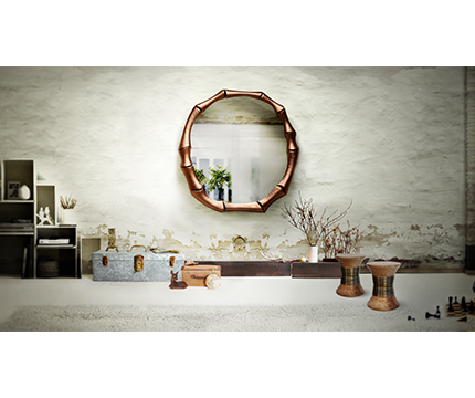 A large round mirror as the center piece in a Japanese villa décor with matching wood and brass stools.