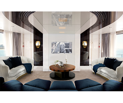 Luxurious yacht design that dreams are made of. Two PEARL Sofas upholstered in velvet stand in front of each other creating a welcoming yet glamorous living area. LALLAN Center Table, made of matte pau Santo wood veneer, stands strong in the middle while two ARUNA Wall Lights, in hammered gold-plated brass, spread a golden light across the room.