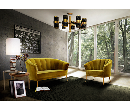 Contemporary lime green sofa and armchair creating a flawless living room. A velvet 2 seat sofa and armchair, a rectangular black rug, a black and gold ceiling lamp, a brass side table and a modern table lamp compose an elegant living room set.