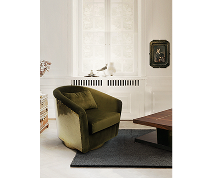 A green single velvet chair and a rectangular coffee table are key pieces for a reading corner decor.