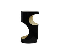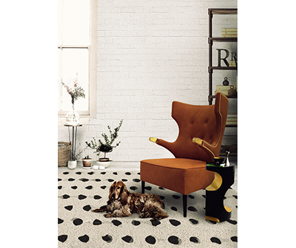 BA wingback orange velvet armchair with a matching black and gold side table, a modern bookcase and a black and white hand tufted rug compose this reading corner set in this modern living room.