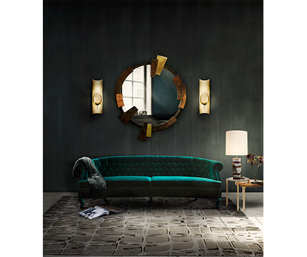 A green emerald sofa with capitoné in a modern home décor. This fierce living room set counts as well with the gold from the wall lamps and round mirror to contrast with the other pieces.