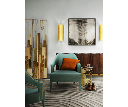 A midcentury living room with warm colors, perfect for an autumn and winter décor. Brass, wood, twill and hand-tufted tencel work very well together. The blue twill accent chair with the small gold side table are the center pieces.