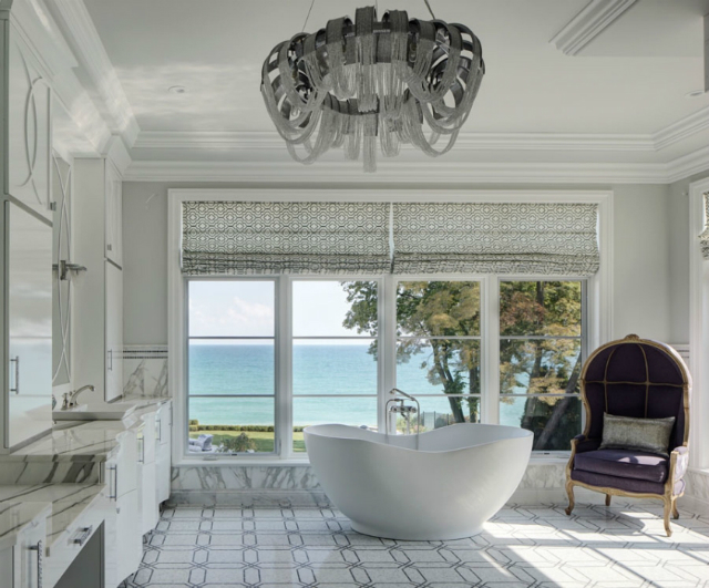Luxury bathroom with white bath tube and marble counter. Look at the gorgeous purpler chair in the corner.