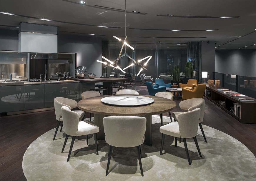 The building’s unique circular design and floor-to-ceilling windows highlight its elegantly ethereal personality, while the upper floor features sophisticated wood-strip paneling. Benefiting from the vast experience gained in many years of partnership with architect Rodolfo Dordoni, the Minotti Studio team crafted a visually striking interior.