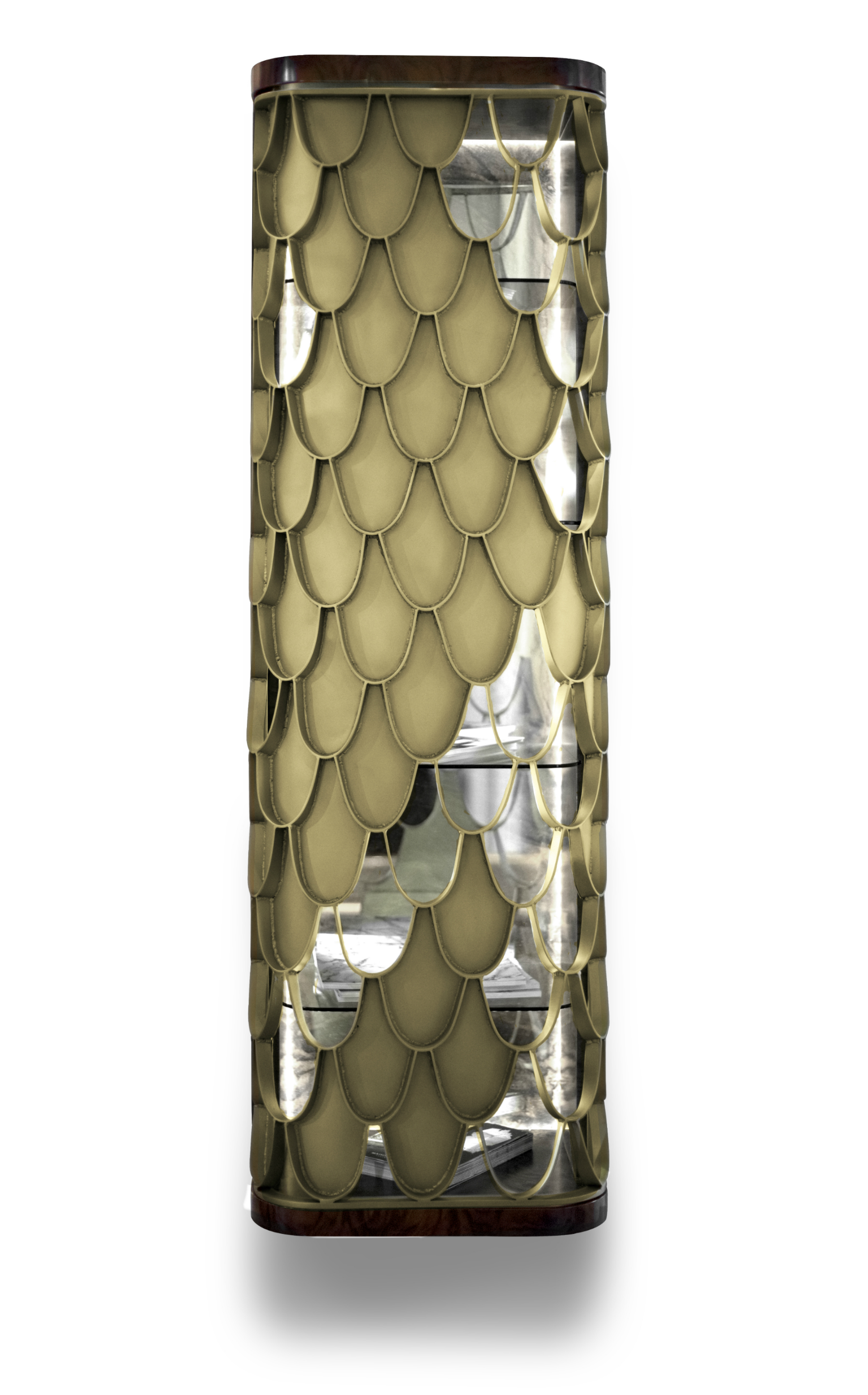 Body in walnut root glossy wood veneer. Door in brushed brass matte.
