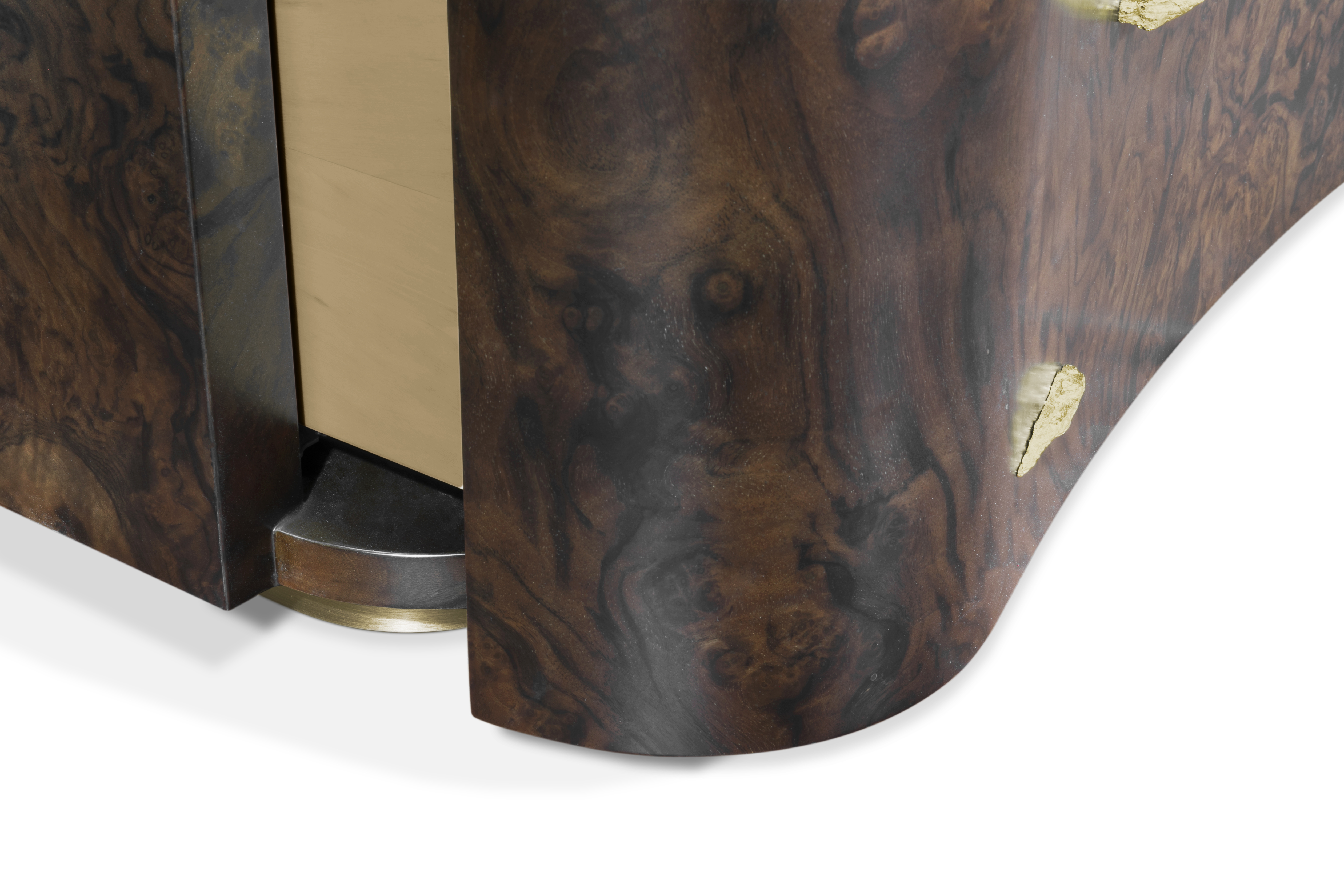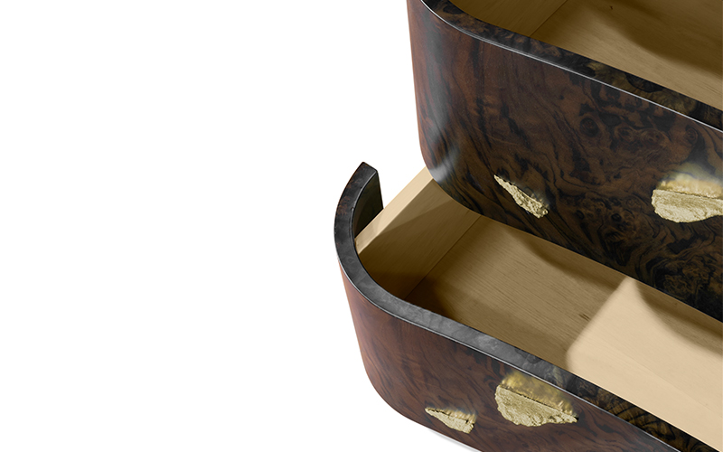 veneer covered with nature-inspired brass details; the base is in matte vintage brass and the interior of the