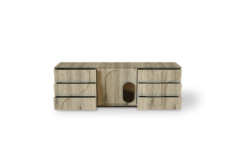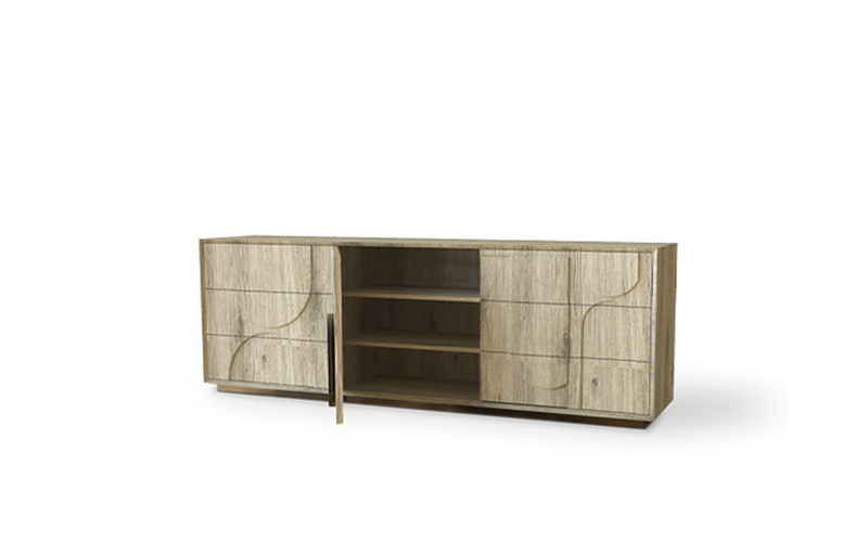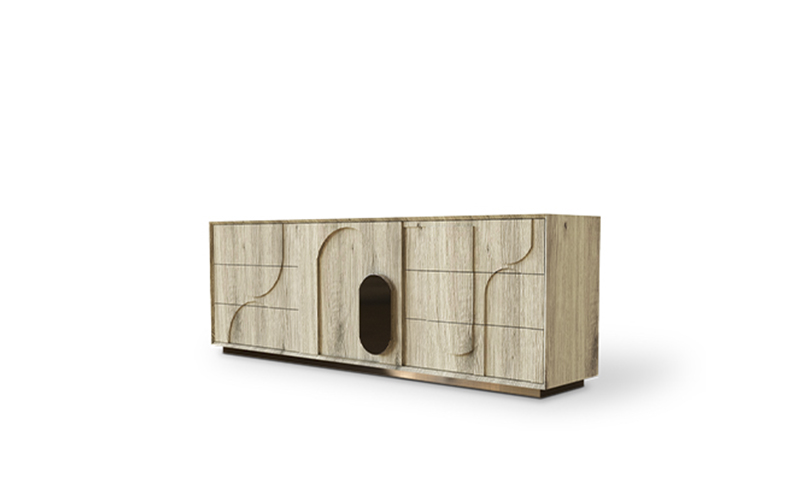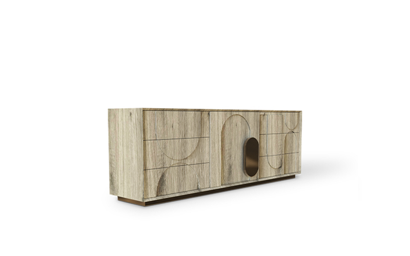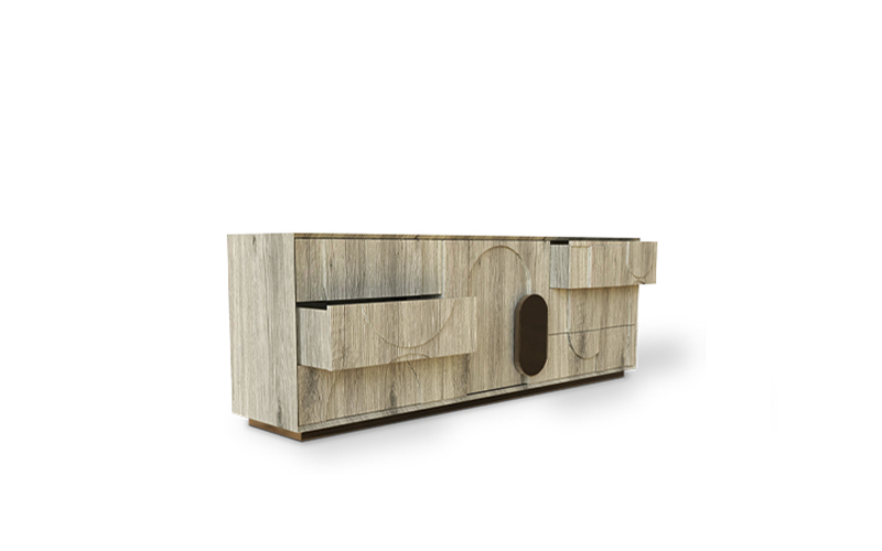 The Boma Plateau is a region in the east of South Sudan, is also one of the few places where the wild coffee arabica grows. This breathtaking landscape serves as inspiration for the Boma modern wood sideboard design, where the round inox aged detail protrudes from the organic pattern of the decape wood, resembling the fantastic mountain that emerges from the plains of the Boma Natural Park. The use of this specific Decapé veneer makes this piece a modern and particular design that suits perfectly every type of aesthetic.
