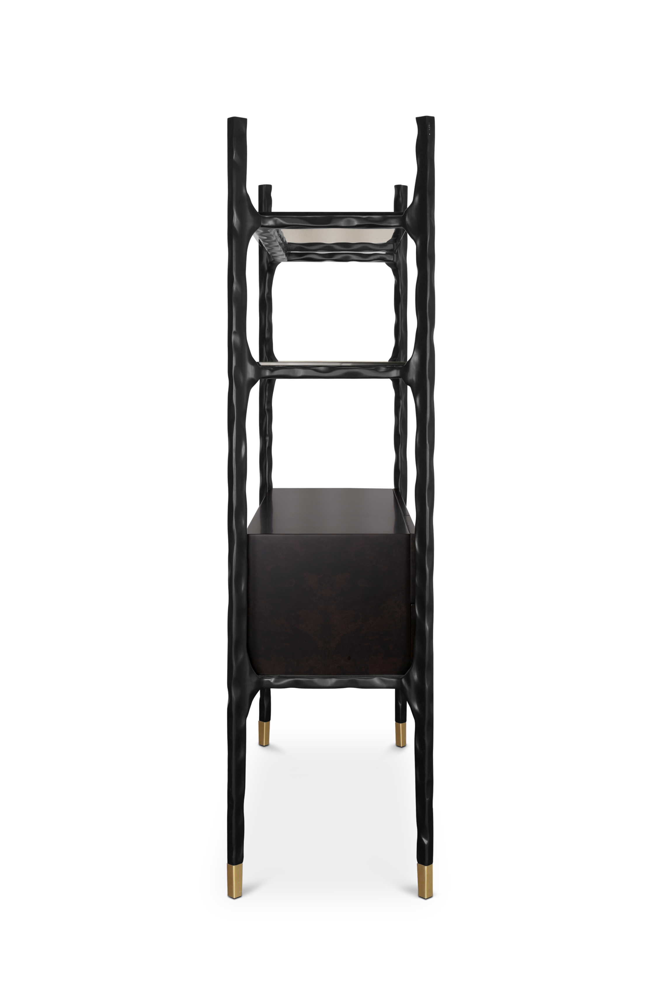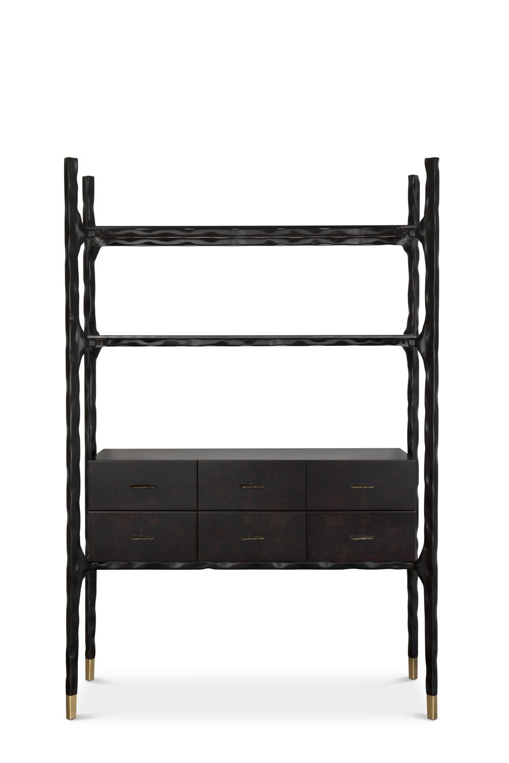 LANKA Bookcase is inspired by a traditional method practised in Sri Lanka, the stilt fishing, now disappearing. The vertical poles embedded into the seafloor are the main reference for the structure of LANKA: in matte black lacquer, it supports the main body covered in matte palisander wood veneer, and with matte brass details. This modern bookshelf is an elegant choice for any room in a modern home office design.