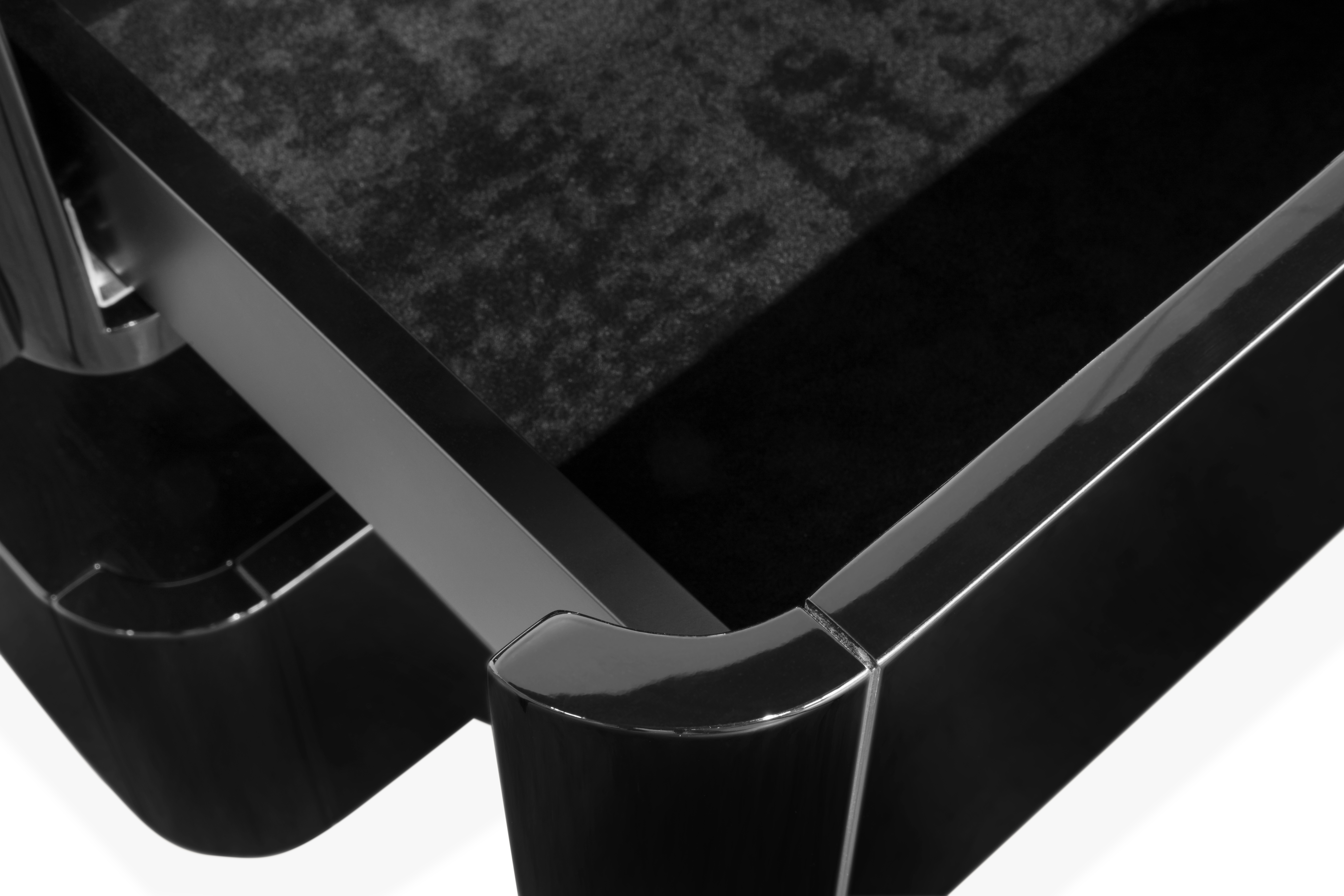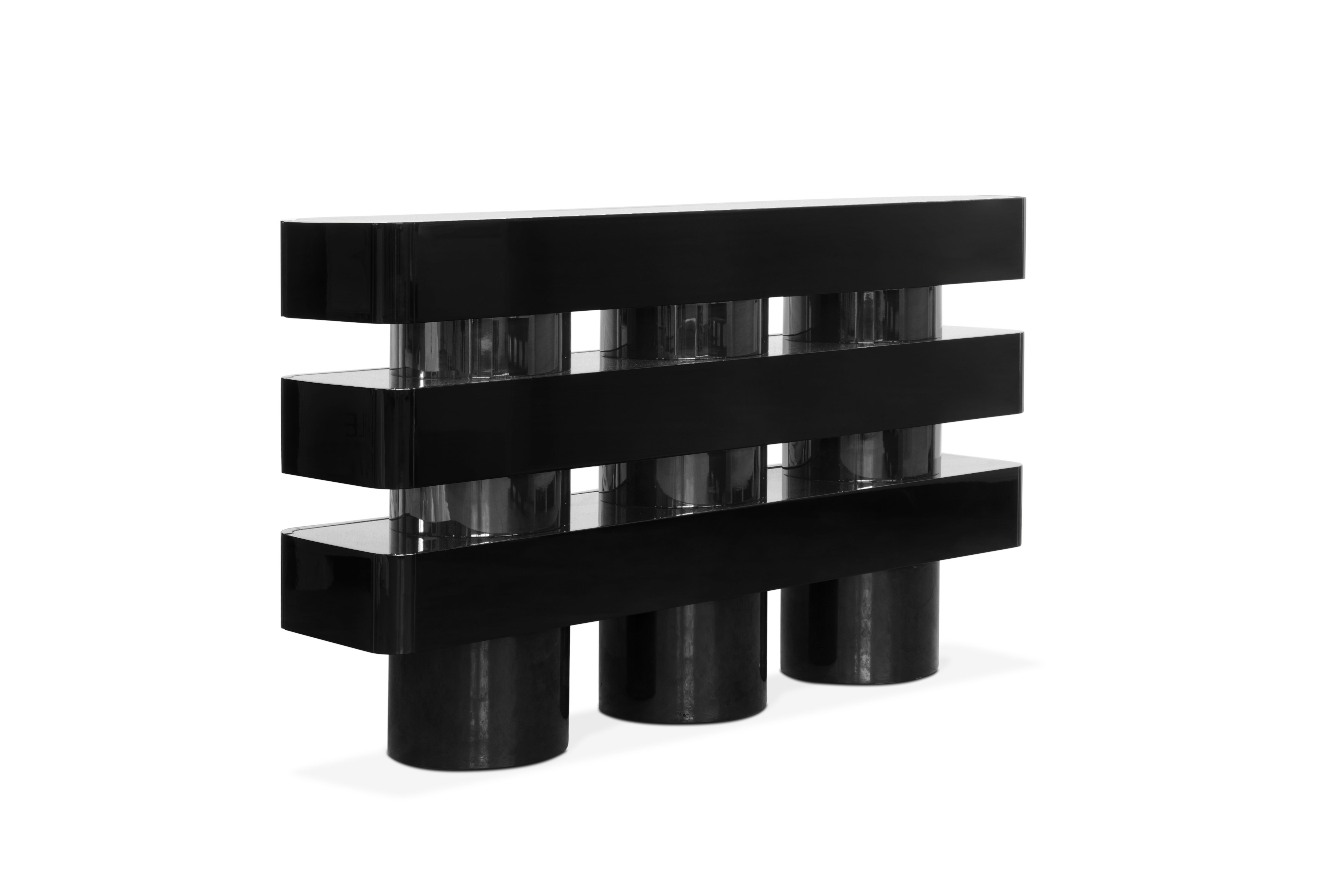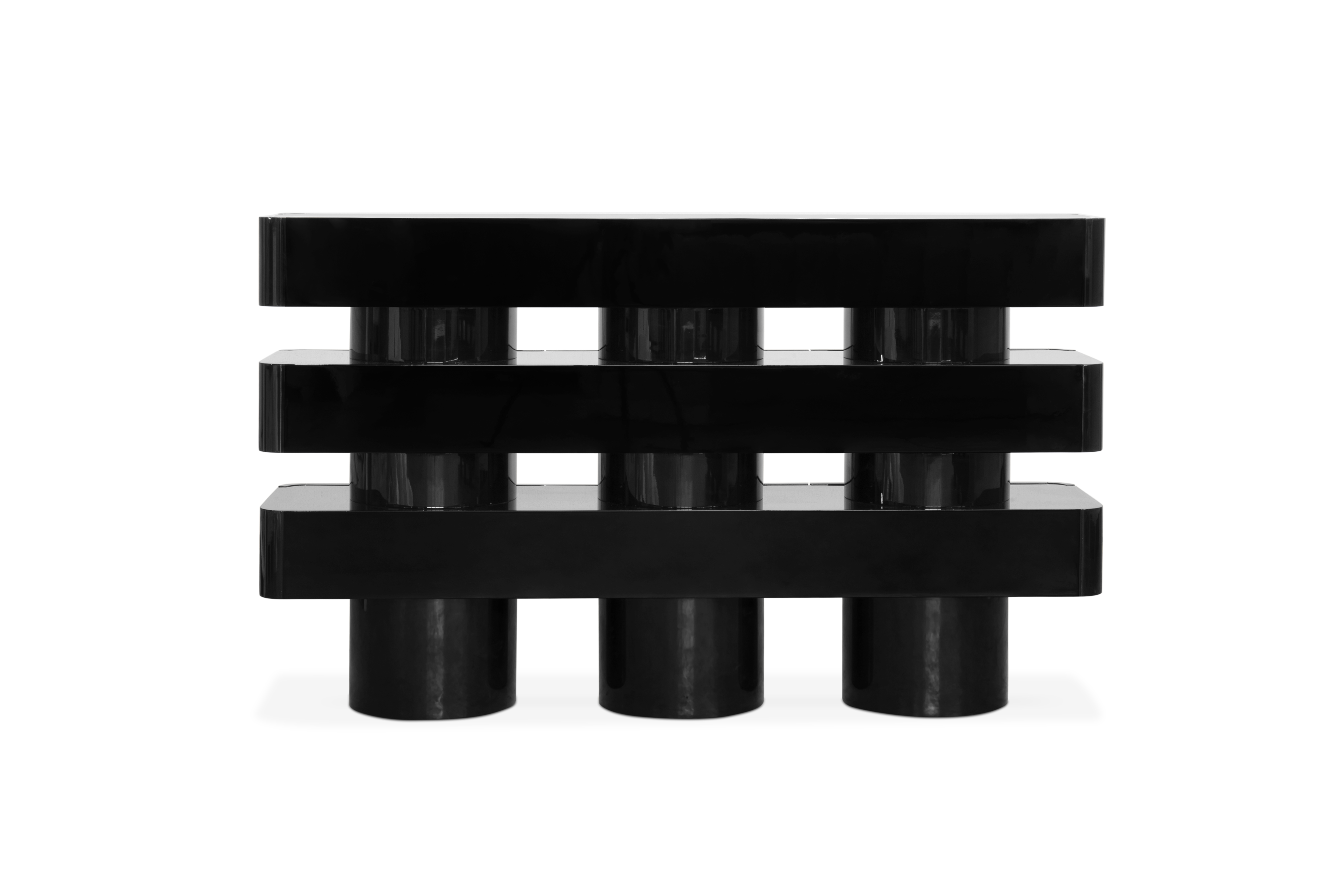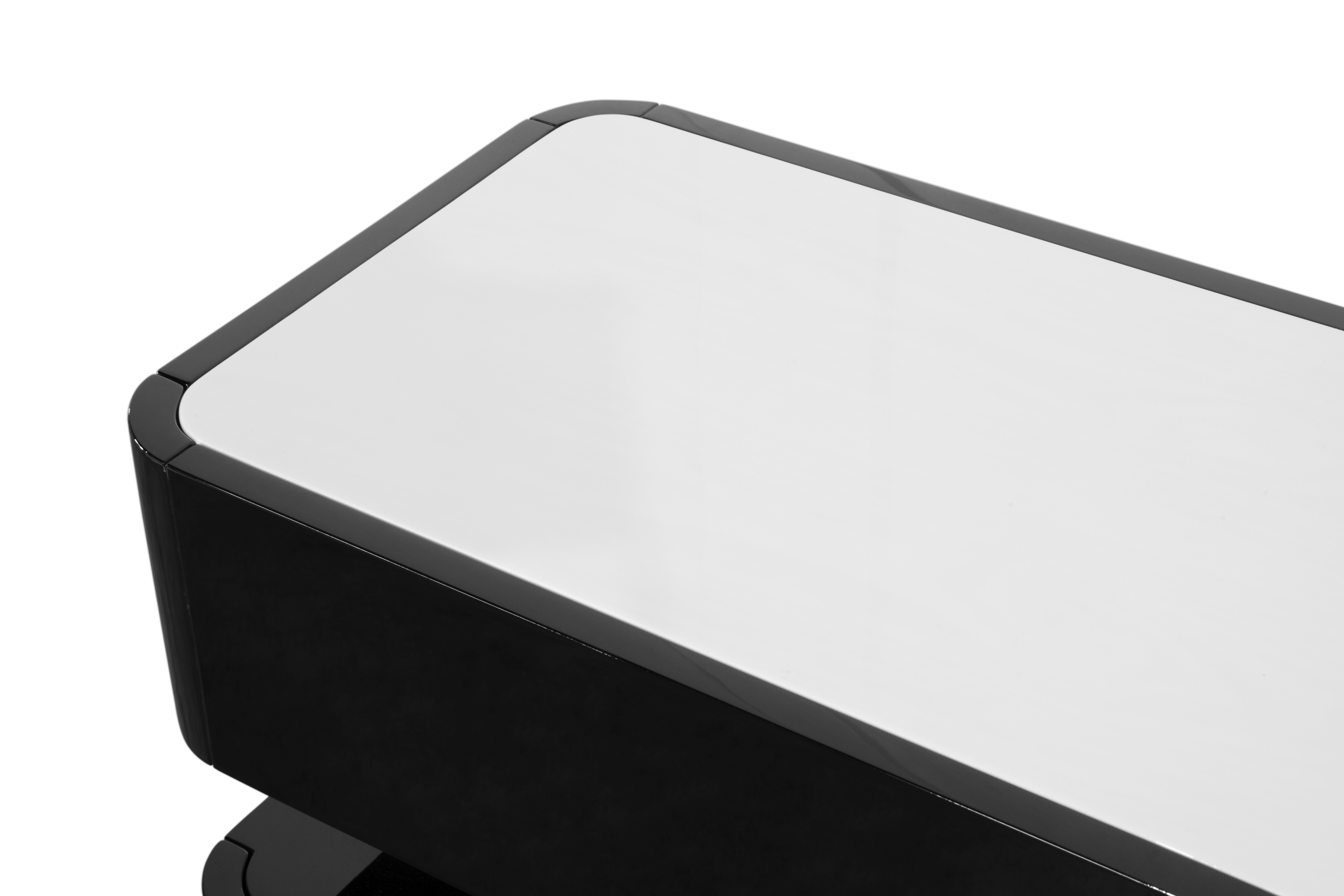 Shinto shrines are places of reverence and the abodes of the 'kami' - gods- where sacred objects are stored in the innermost chamber of the altar, not seen by anybody. SHINTO II Console was designed with a gloss black lacquered structure and ash wood veneer white tabletop, safekeeping everything you set on it. This entryway console table with drawers fits any modern classic set, adding a touch of style and refinement.