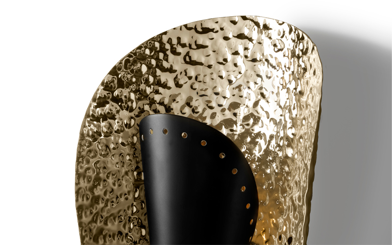 SHELL In hammered gold-plated brass and shader in matt black lacquer or white.