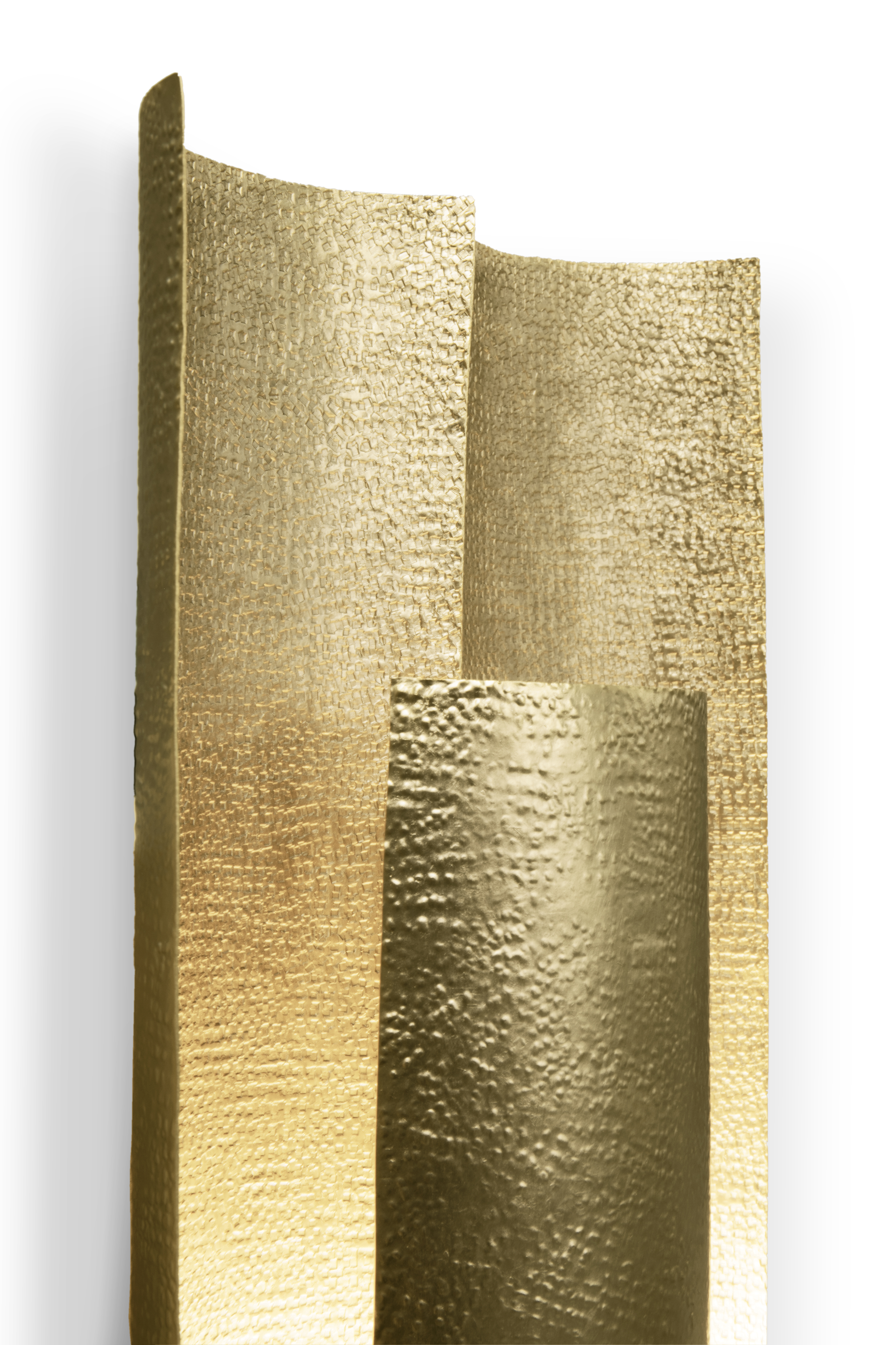Aurum is the Latin word for gold. This imposing metal is also named a contemporary lighting item made of matte hammered brass in a long wall light option. With a unique design, AURUM XL Wall Light will bring comfort in the darkest nights with its warm yet sensitive light. This contemporary wall light is part of the AURUM Lighting Collection that includes also another wall light and suspension light in different shapes and sizes.