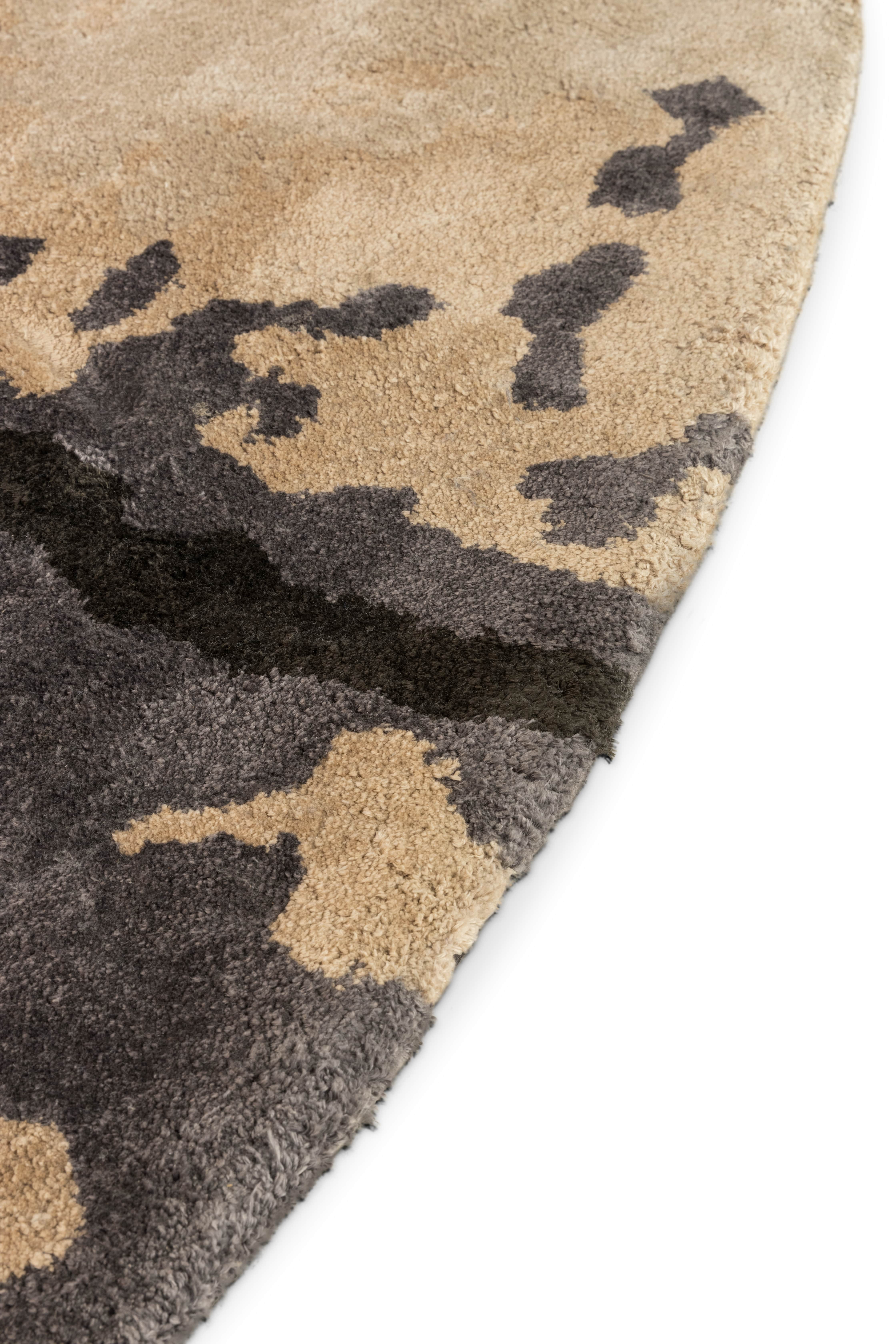 The Gobi is known for its hardest arid conditions and is the largest and driest desert in Asia, bounded by Mongolian and Chinese mountains to all sides. GOBI hand-tufted botanical silk rug depicts the extreme and opposite conditions that occur in this desert through its dark grey and sandy tones, applied in irregular but incisive shapes. GOBI Round Botanical Silk Rug fits well in a sober and strong ambience of a living room or a dining room.