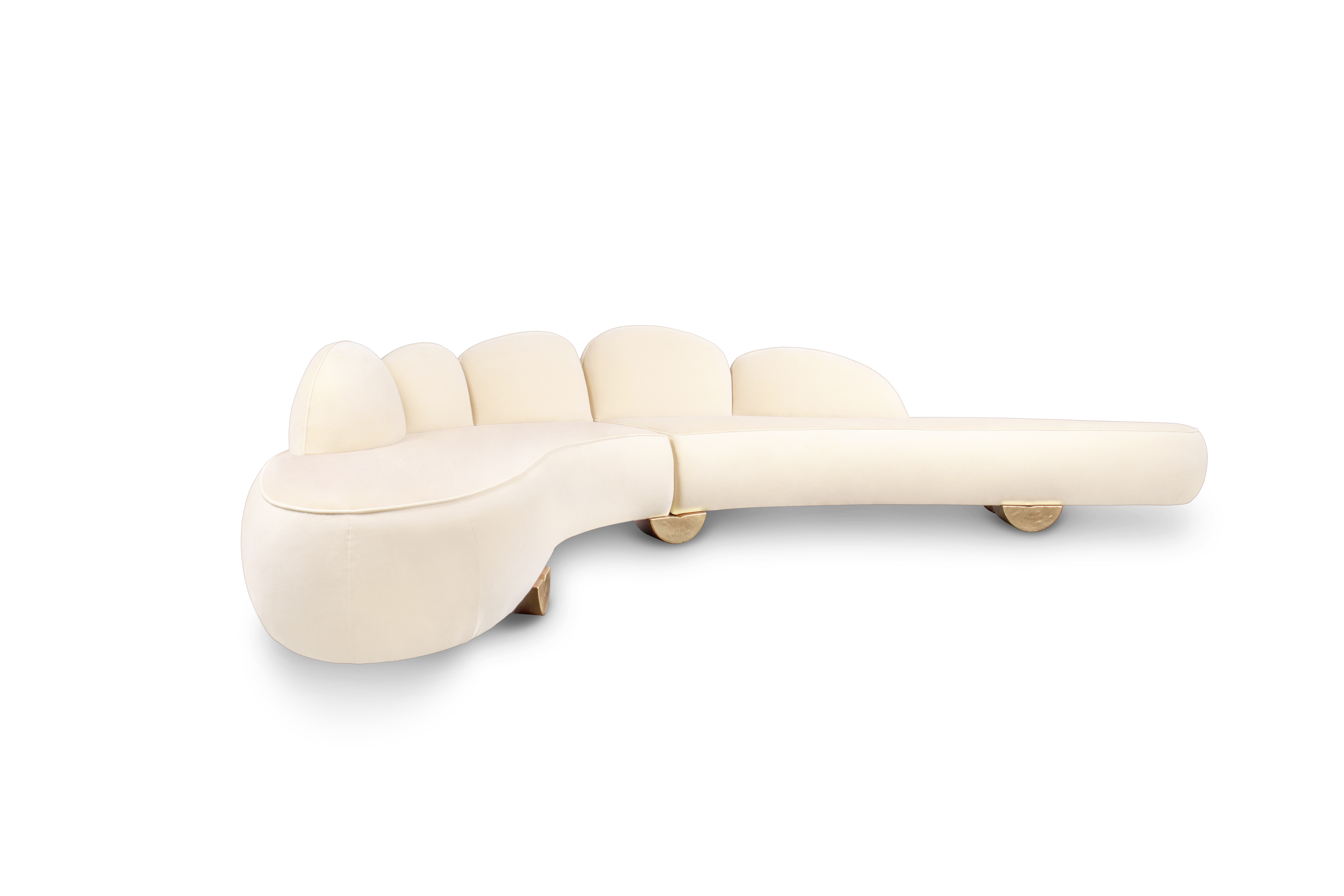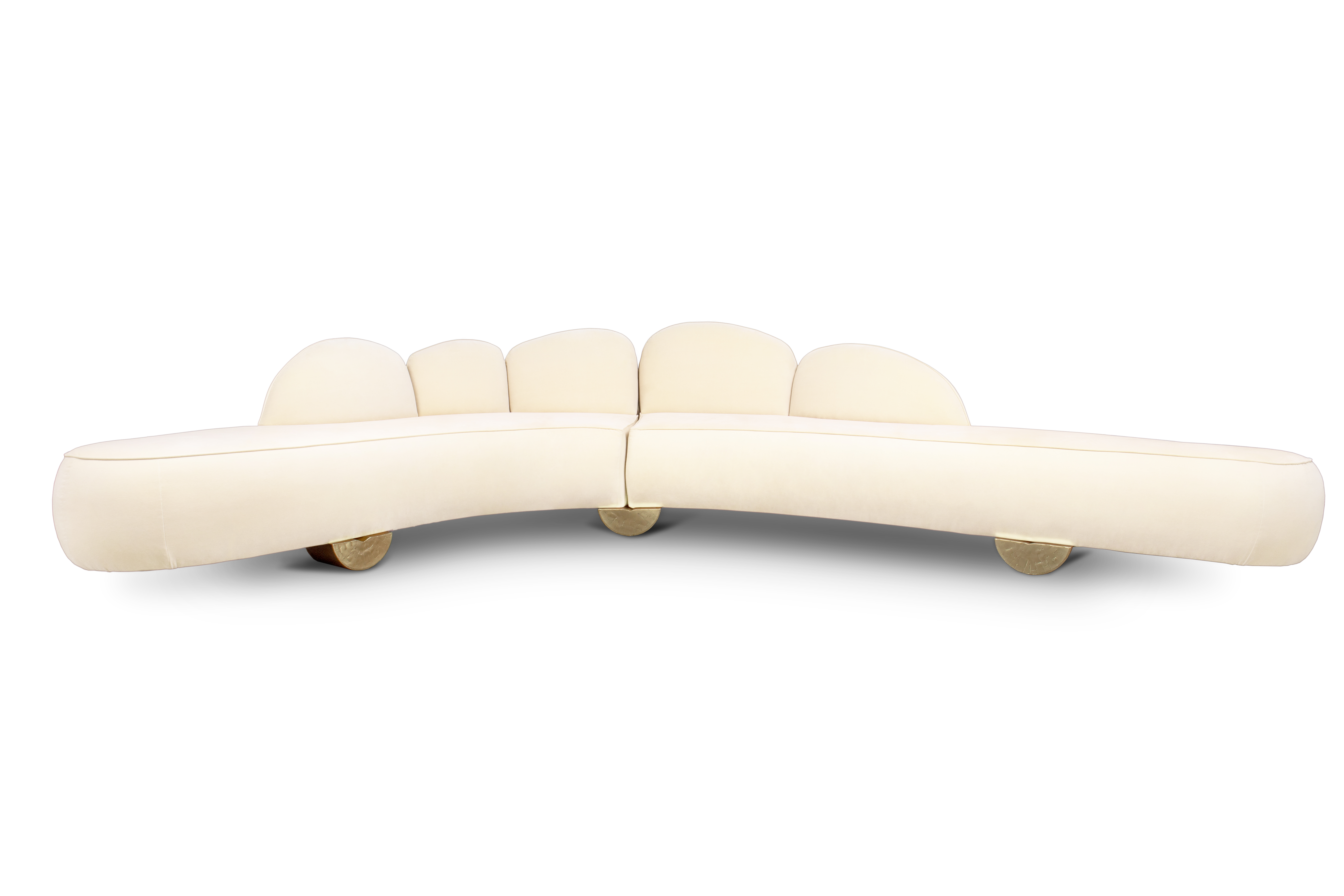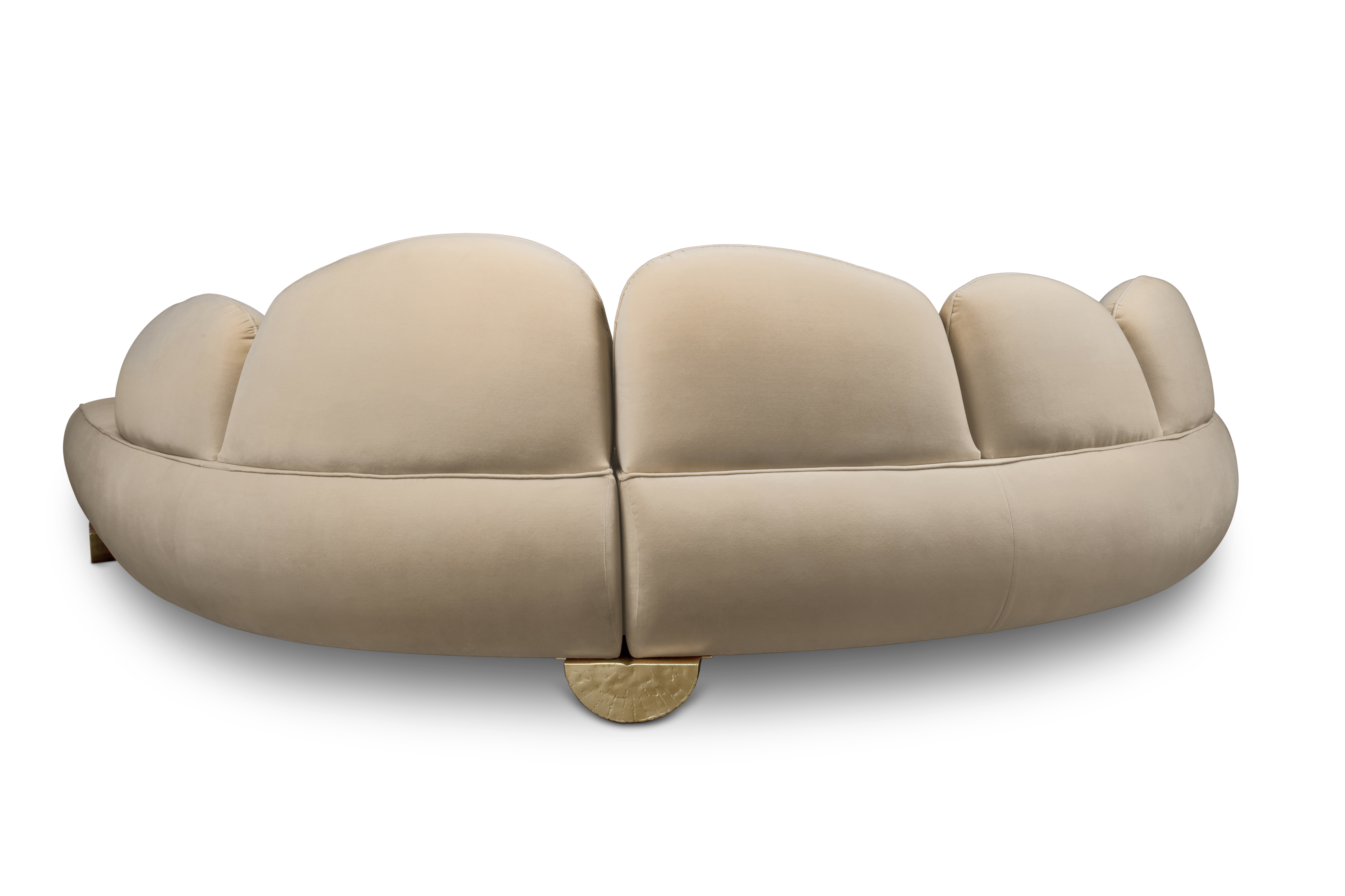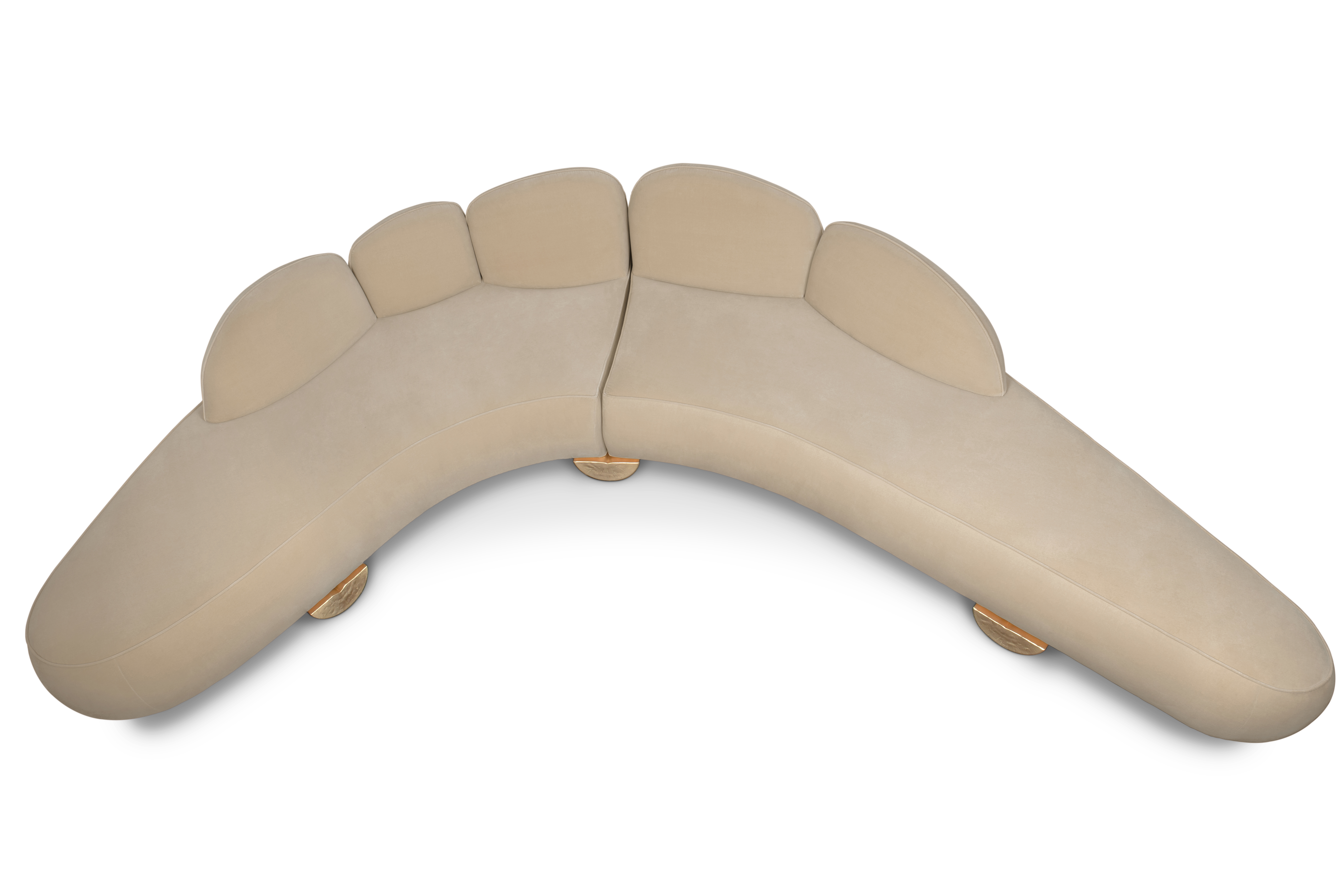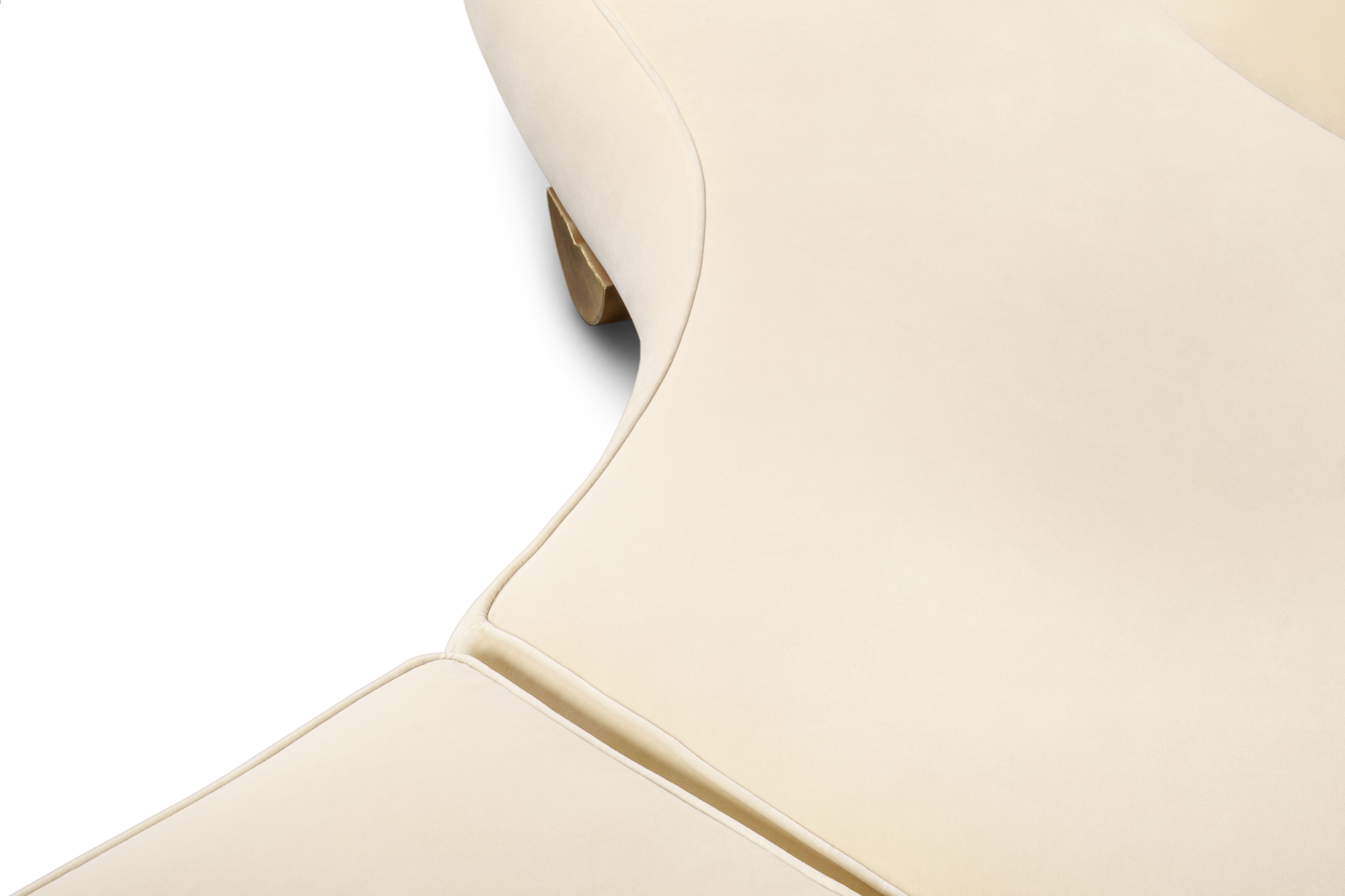 FITZROY Sofa is inspired in Mount Fitz Roy, a mountain in Patagonia, whose name is a tribute to Robert FitzRoy, the captain of the ship that transported Charles Darwin in his travel around the world. This curved sofa, with its back inspired in the outstanding mountain shape, is fully upholstered in cotton velvet and the base is in matte casted brass. FITZROY Modern Corner Sofa will add an organic element to any living room set.