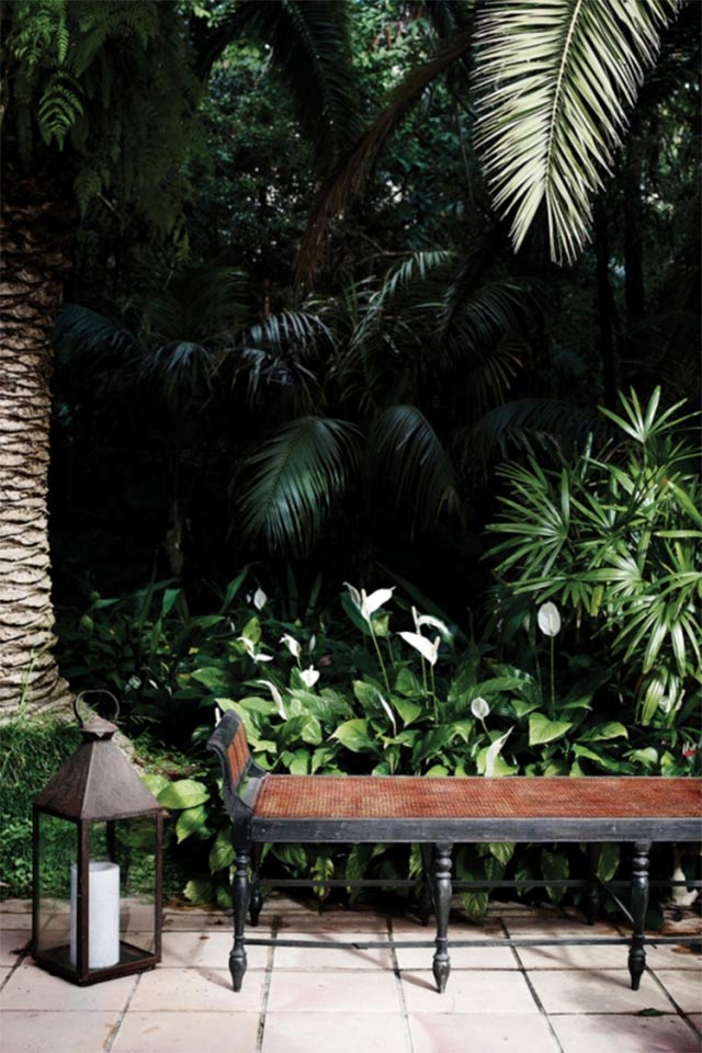 In the garden, a daybed is accessorised with brass hurricane lamps from Les Interieurs.