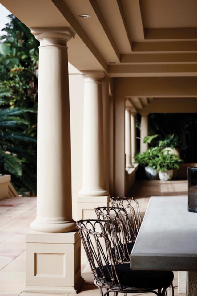 Annie Wilkes Design was brought in to oversee lush greenery framing the balcony that overlooks the harbour at the front of the house, and at the back, where a pool and a cabana are located. The custom outdoor daybed is from Les Interieurs.