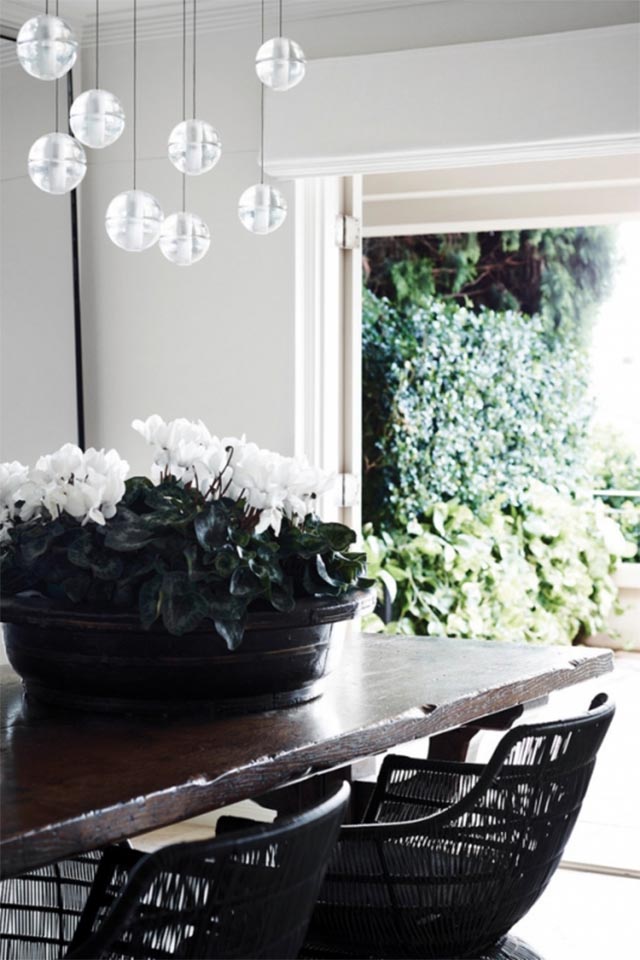 In the dining room, a black timber Chinese bowl from Les Interieurs sits atop a French oak dining table from Sally Beresford. Pendant lights and dining chairs add drama, while custom-made metal-framed mirrors from Les Interieurs enhance the sense of space.