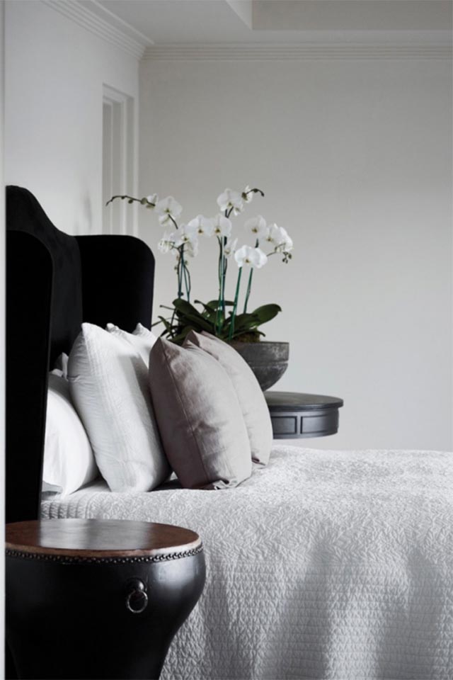 In the main bedroom, white bedding and accent cushions in linen from Les Interieurs lighten the heaviness of the custom-made wingback bedhead in black linen, and the leather drum, both from Les Interieurs.