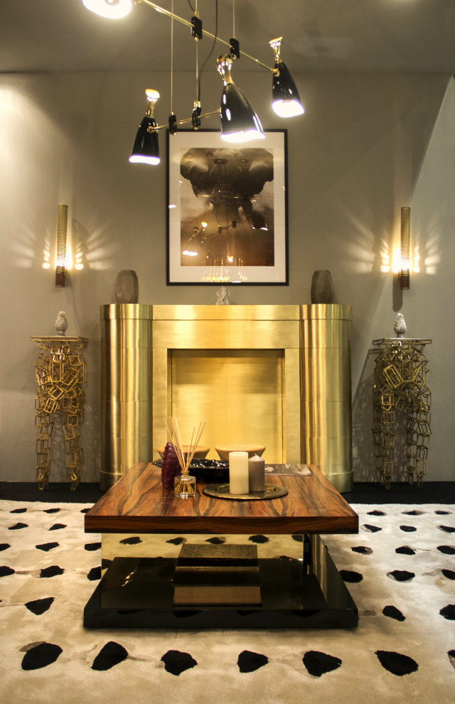 Fall trend ideas: modern living room with white fireplace, rugs, velvet sofas and center table.