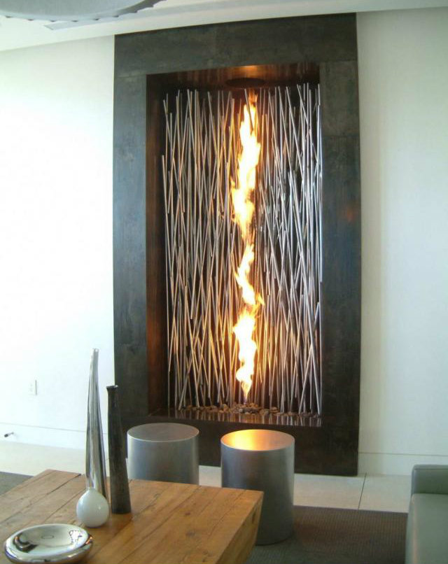 Fireplace design: grey stone walls.