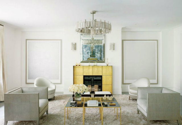 Gold fireplace at a white and gold living room design.