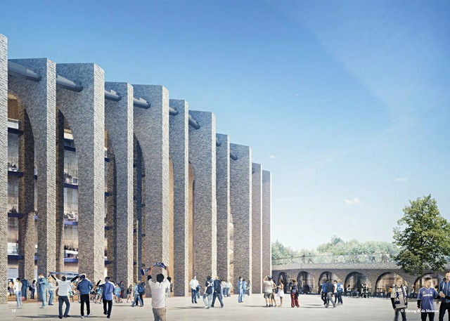The most prominent new feature will be a series of brick piers that extend over the existing stadium form to support a steel ring above the pitch, covering an increased number of seats. The piers are intended to reference local brick architecture, and also create a covered walkway around the perimeter of the building.