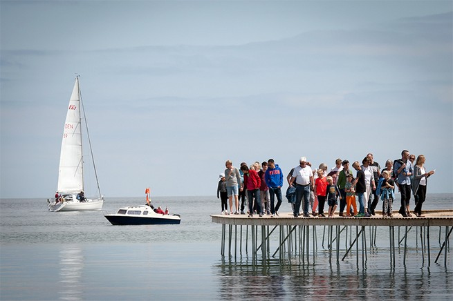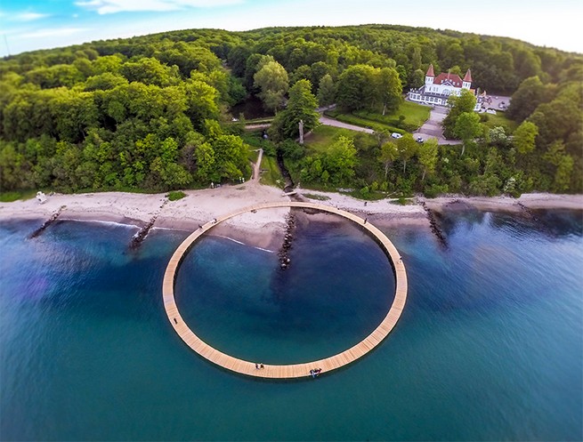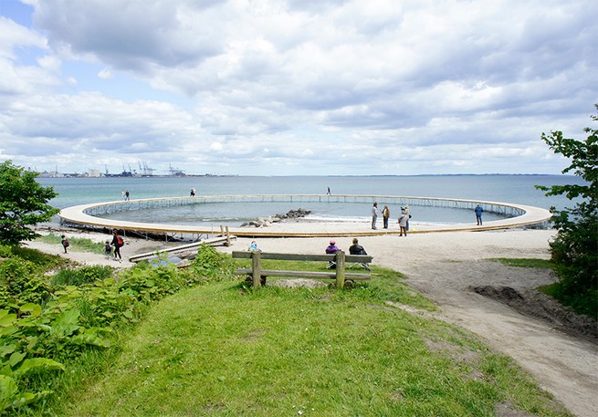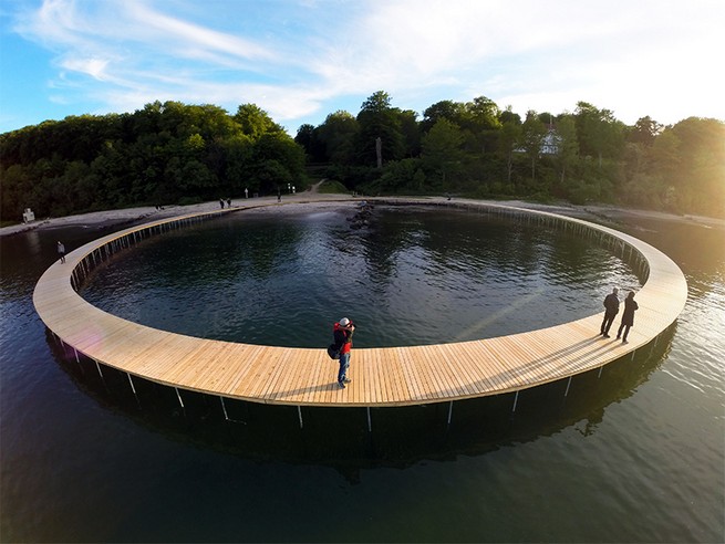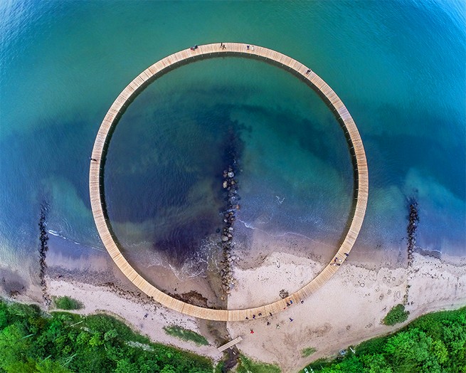 During this year’s sculpture by the sea festival in Aarhus, Denmark, Danish practice Gjøde & Povlsgaard Arkitekter have added ‘the infinite bridge’ to the picturesque coastal landscape. The circular structure spans from the sandy shore out to sea, elevated just above the surface of the water — depending on the tide. The infinite bridge’ has been realized for the exact location, and refers to a historical, demolished jetty on the site.