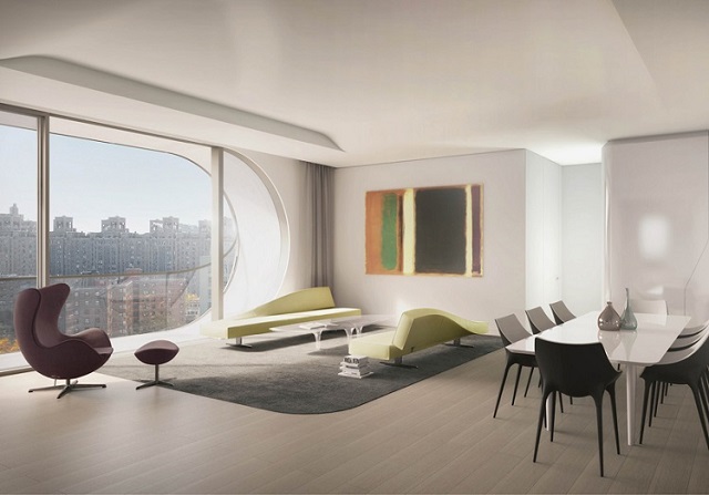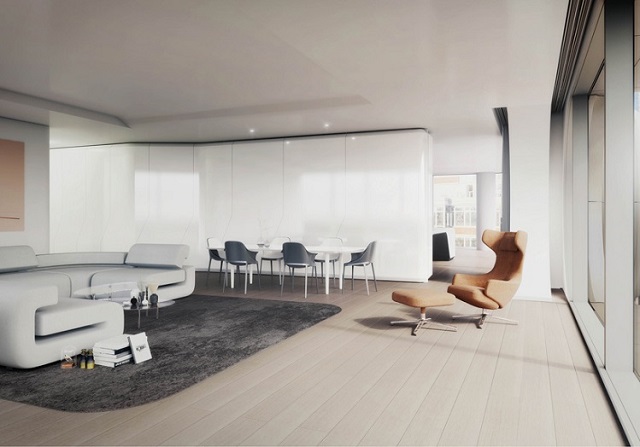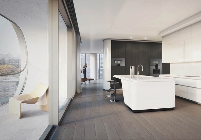 Hadid-designed kitchen islands include sculpted white marble and high-gloss formed millwork, integrating italian brand boffi’s xila collection. Wide-plank white oak flooring adds warmth and texture throughout each of the residences.