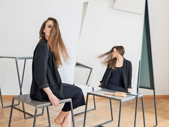 Steel sections form triangular frames for mirrors and matching furniture at a minimal hairdresser in Zurich by local studio Raum404….