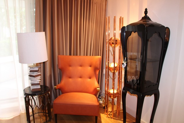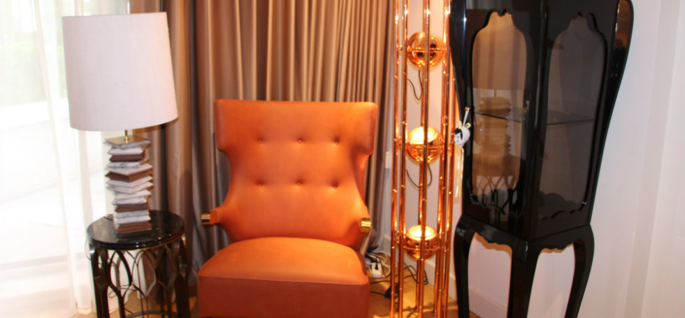 *BRABBU’s KENDO copper floor lamp, SIKA armchair, APACHE table lamp, MECCA brass side table
