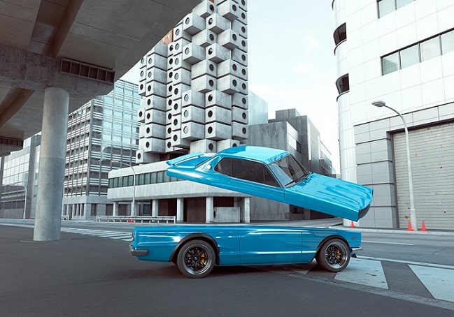 Four vehicles — a honda NSX, datsun 240Z, datsun skyline GT-R and the toyota AE86 — are digitally distorted, stretched, twisted and tangled as they drive through the empty urban landscape. The video and accompanying graphics sees two passing cruisers suddenly interlock in a strange sculptural geometry, a yellow toyota elongated to accommodate two cartoon characters in its void, and an electric blue datsun sliced in half as it hovers in mid-air.