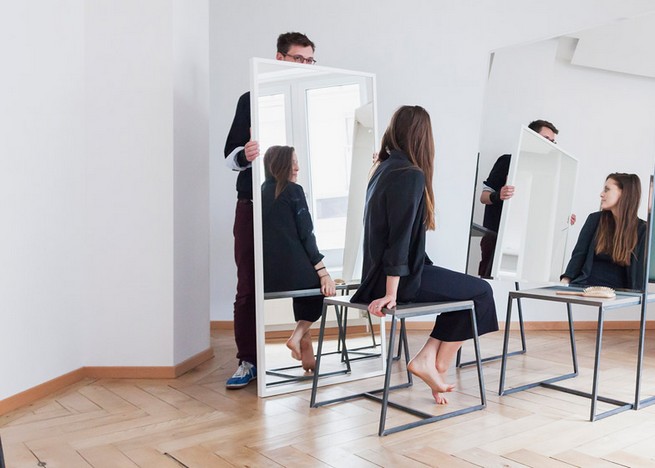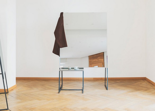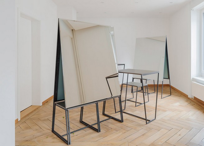 Based on the shape of a children’s chalkboard, the double-sided mirrors are mounted on 15-millimetre square steel frames. The designers named the collection Nine Degrees after the size of the acute angle formed where the slanted mirrored panels meet at the top.