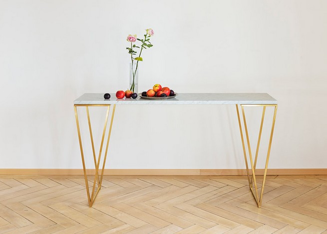 The collection also includes a marble console, supported by a pair of upside-down triangular legs made from copper.
