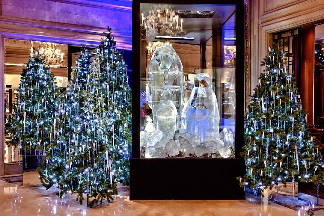 Not quite a tree and more specifically a forest of trees, the George V’s holiday installation, euphemistically called Arctic Fantasy and created by their artistic director Jeff Leatham, is really a foil to the main attraction in the hotel’s marble courtyard, two giant polar bears made out of mirror. (Inside, penguins made of a similar material bring a surreal touch to the hotel’s elaborate lobby.)