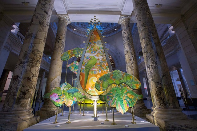 In a departure from the usual weak gestures toward other religions during the holiday season (nothing so bleak as a small plastic menorah next to a 35-foot-tall spruce, blazing with light), the V&A has gone the extra mile with Kalpataru: The Wishing Tree by Delhi-based designers Sarthak Sengupta and Sahil Bagga. It’s a colorful ensemble of free-standing structures (in a tree-light arrangement) handcrafted of beaten brass and painted with classic Indian motifs by artists from Kerala.