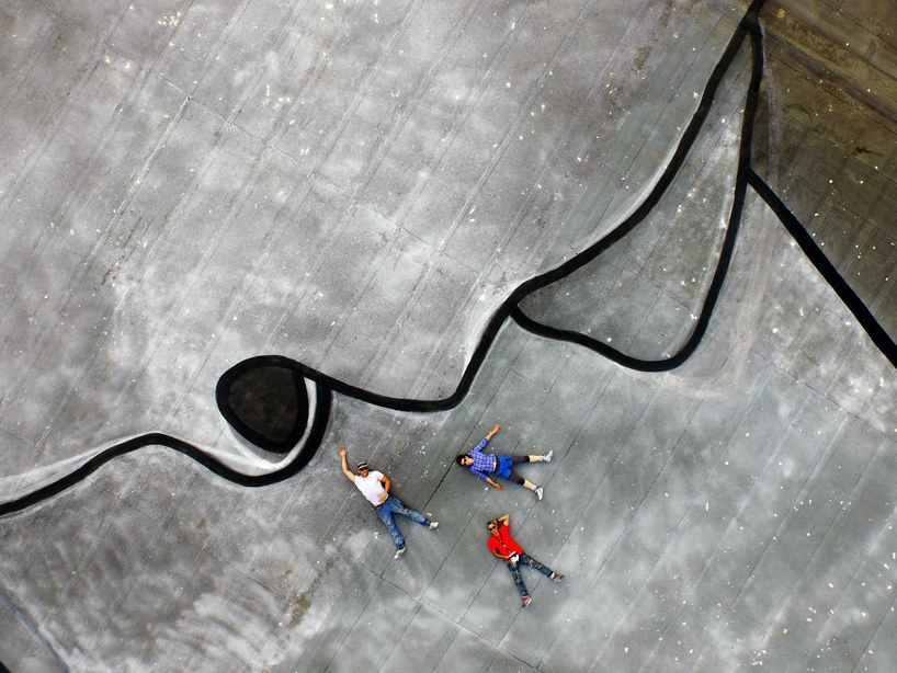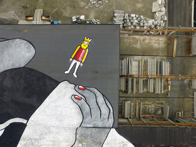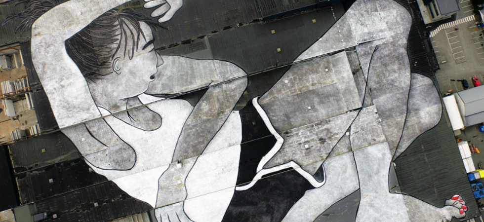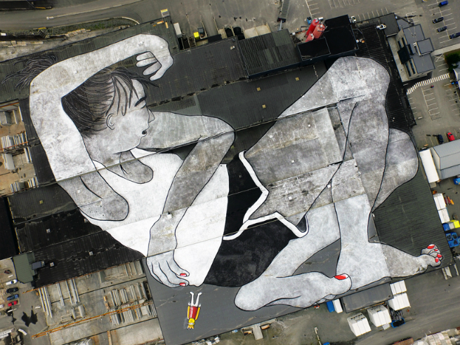 For the 2015 edition of the Nuart Street Art Festival in Norway, french artist duo Ella & Pitr have completed the largest mural in the world. The 21,000 square meter rooftop of construction company block berge bygg is canvassed by ‘lilith and olaf’, a colossal painted figure curled up on the building ceiling.