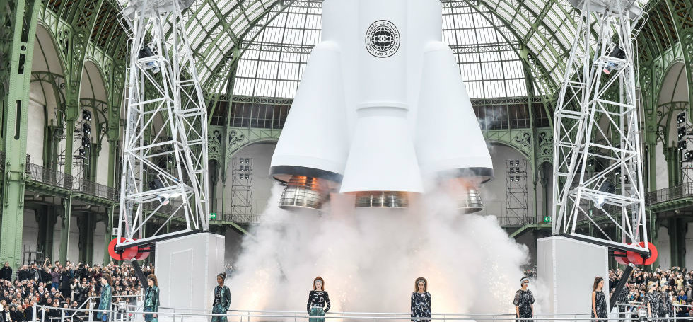 Yes, you read it just right – a 35-metre-tall rocket, which launched 10 meters into the air, all the way up to the 120-year-old glass ceiling of the Grand Palais, at the end of the Fall 2017 Chanel show.
