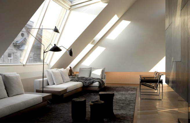 Architects studio Bernd Gruber designed a stylish loft in the Austrian capital. This residence is located on the top floor of an old building; the interior design concept is based on classical modernism. The focus of the project is given to the quality of materials and impeccable execution, able to pass the test of time. Large sloping windows set a special mood, filling the loft with light.