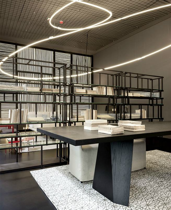With its four different settings fit for a dream-house, created with the contribution of Kerakoll for the finishings and Flos for the lighting, the Living Divani Temporary Store Torre Velasca designed by Piero Lissoni is a sophisticated contemporary haven, when a neon light sculpture on the ceiling, a tribute to Lucio Fontana, seems to absorb the energies and tensions of the city, bestowing unexpected moments of relaxing. The first living area introduces visitors to the refined world of Living Divani, playing with the visual cross-reference between the Lipp sofa, a interpretation of the refined capitonné working with the brand’s typical contemporary geometric spirit, and the new Easy Lipp sofa which recaptures the characteristic features and tempering them, like the quilting and the slender metallic leg, moulding the settings with character and lightness.