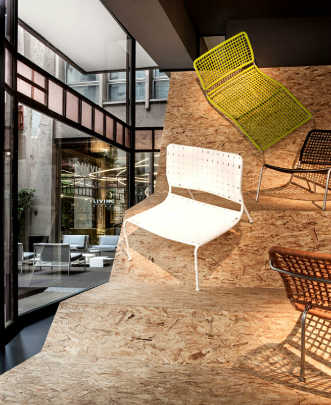 Finally, the walls feature the FJU desks by khaschisch in the new Stone Oak®finishing, offering a practical workspace that can be closed to free up space whenever you need, creating a wall-mounted container for small objects or a magazine rack. The displays also continue outside the showroom in the square surrounding the tower with an outdoor setting designed by Piero Lissoni and conceived as a temporary public space donated to the city, thus highlighting the three different souls of the Living Divani collection.