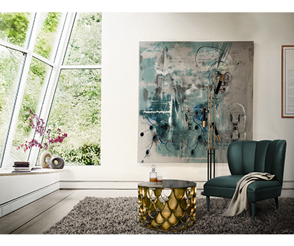 A modern synthetic leather chair next to a round coffee table with brass scales and a grey squared rug composing an inviting living room set.
