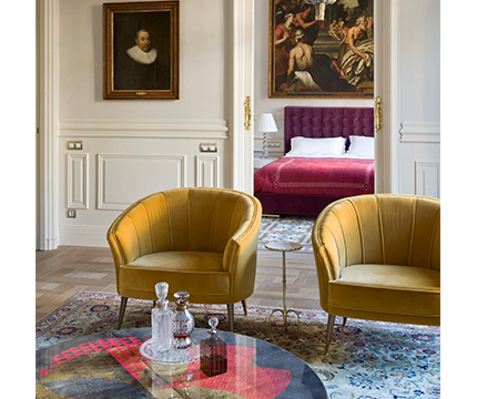 Recdi8 studied the building's history and the apartment itself in Barcelona's Example district so as to be able to recover the original elements that have been disappearing during the last decades. The new finishings, the furniture and the decoration have been chosen under the inspiration of nature, Rococo and Romanticism. BRABBU, natured inspired has integrated the project with four MAYA Armchairs in green/lime cotton velvet. The pieces were chosen to be part of the mid century modern living room décor.